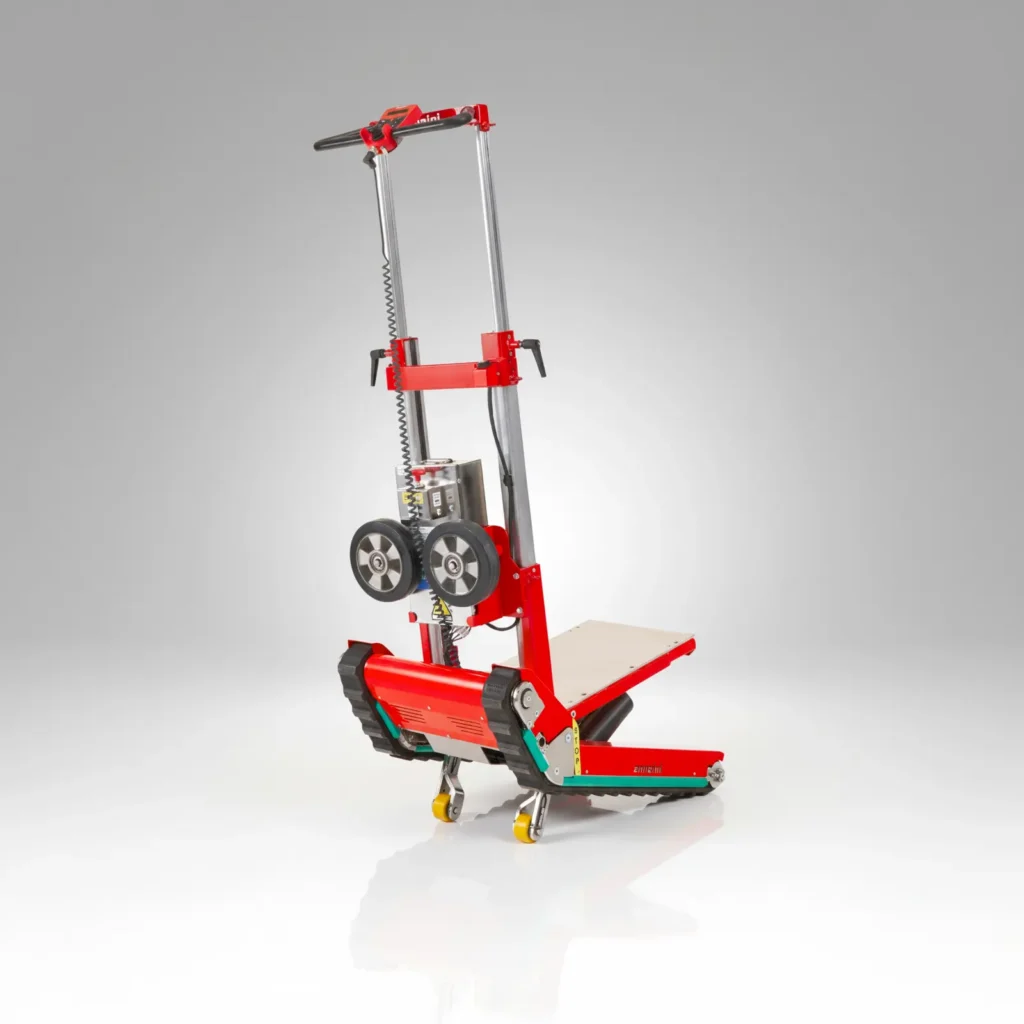 Domino ist ein elektrischer Treppensteiger mit rutschfesten, kratzfreien Raupen von Zonzini. Anders als herkömmliche Treppenkarren mit Rädern sorgt er für maximale Stabilität der Last und entlastet den Bediener – sowohl auf Treppen als auch auf ebenem Boden.