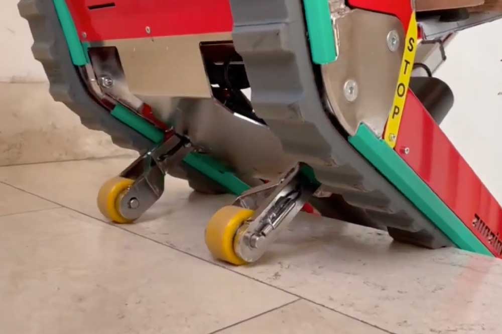 Domino ist ein elektrischer Treppensteiger mit rutschfesten, kratzfreien Raupen von Zonzini. Anders als herkömmliche Treppenkarren mit Rädern sorgt er für maximale Stabilität der Last und entlastet den Bediener – sowohl auf Treppen als auch auf ebenem Boden.
