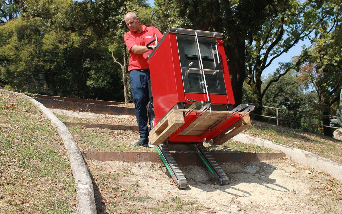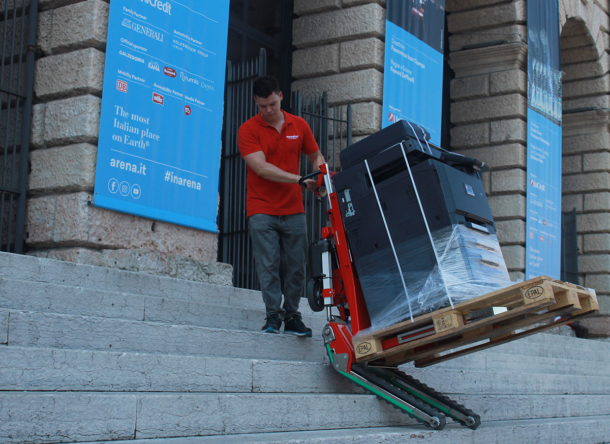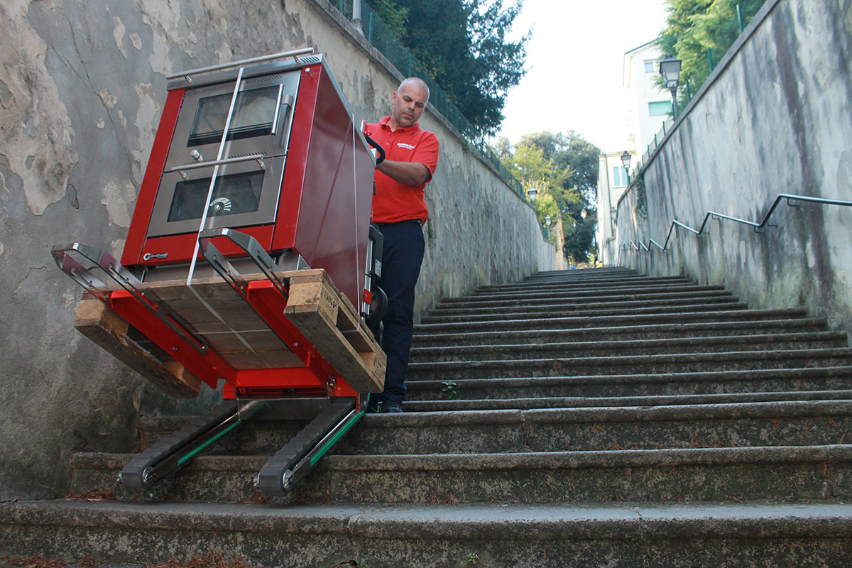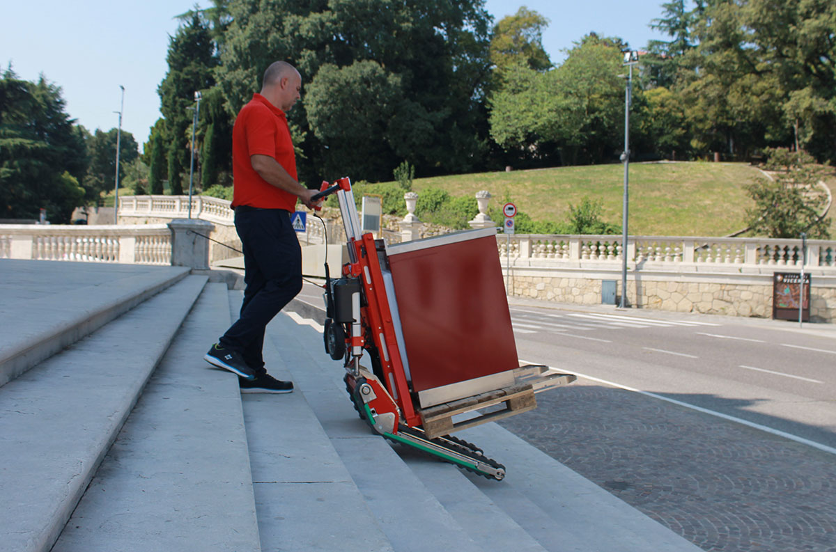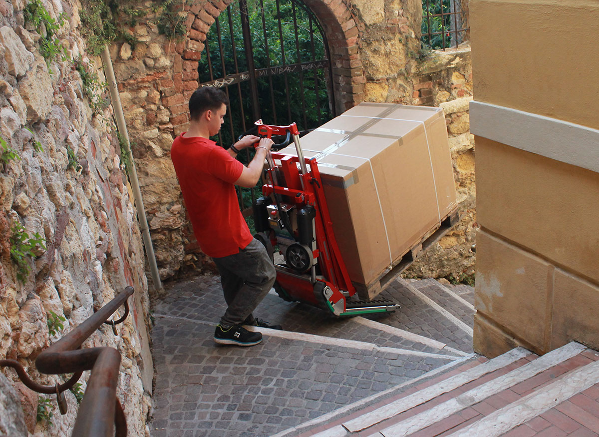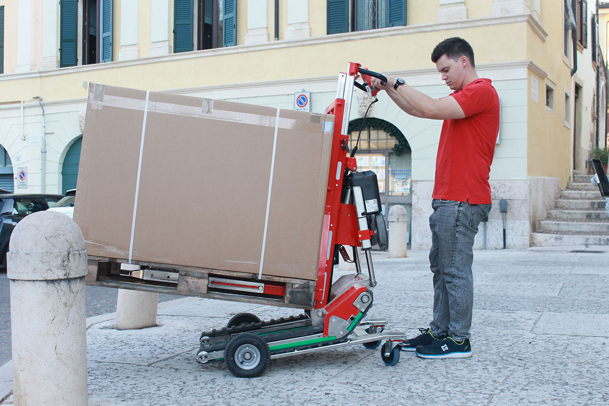 Domino PT ist ein elektrischer Treppensteiger-Hubwagen, der Paletten wie ein herkömmlicher Hubwagen aufnimmt, aber dorthin gelangt, wo andere stehen bleiben. Er hat eine Tragkraft von 450 kg, hebt bis 65 cm und neigt sich nach hinten, um die Last besser zu kontrollieren.