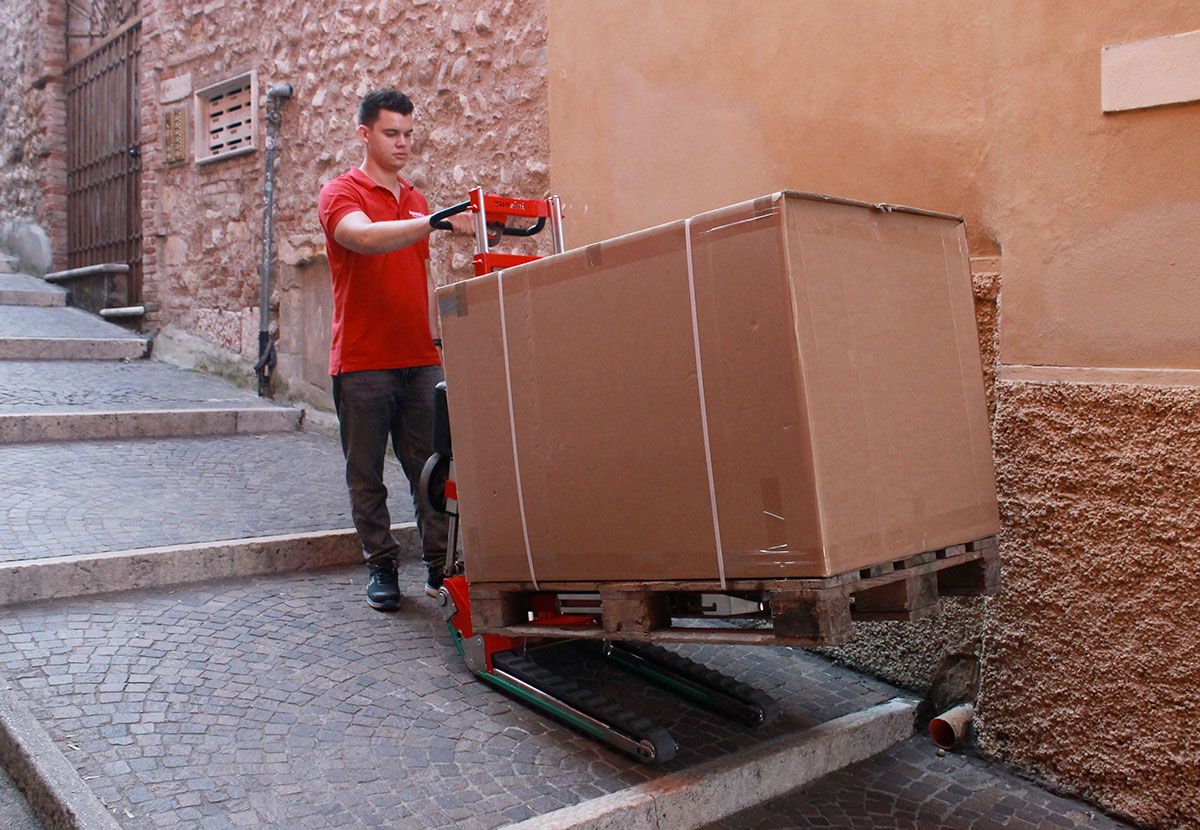 Mit den Raupen bewegen Sie sich dort, wo ein herkömmlicher Elektro-Hubwagen stehen bleibt. Rasen, festgetretener Boden, Schotter, beschädigter Asphalt und unebene Pflasterungen mit Schlaglöchern sind kein Problem mehr. Überwindet Bordsteine, Steigungen und Stufen und erleichtert so den letzten Abschnitt der Lieferung bis zum Endkunden – auch im Freien oder auf der Baustelle.